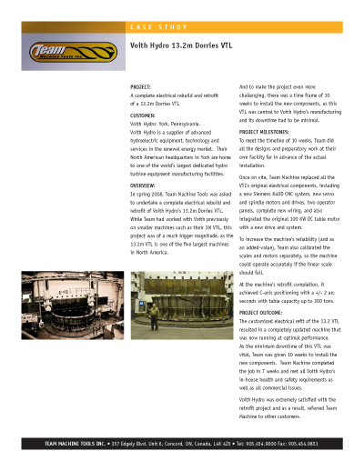 In spring 2008, Team Machine Tools was asked to undertake a complete electrical rebuild and retrofit of Voith Hydro’s 13.2m Dorries VTL. While Team had worked with Voith previously on smaller machines such as their 3M VTL, this project was of a much bigger magnitude, as the 13.2m VTL is one of the five largest machines in North America.